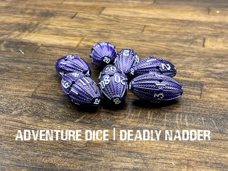 Deadly Nadder metal dice set are purple metal with white numbers. These metal dice are hollow, and jingle when rolled together.