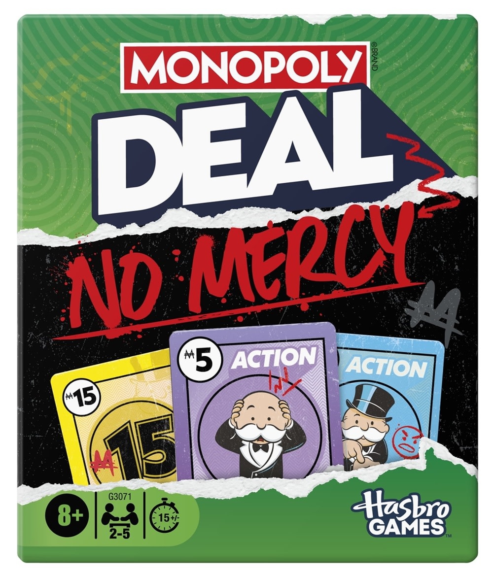 Make bank, not friends in the most ruthless Monopoly Deal edition yet! In the Monopoly Deal No Mercy game, get ready for meaner swaps, sneakier deals, and nastier schemes. Players compete to be the first to collect 3 property sets. But unlike in the classic Monopoly Deal game, a set can be stolen instantly! That’s because Action cards got a mean makeover—use them to charge double rent and even force someone to hand over their Bank. When a player can’t pay an opponent, they must fork over a debt chip and pay them back with one of their cards. This wildly fun family card game is one of the best card games for game nights, parties, and anytime play, and it’s a great portable game for travel.