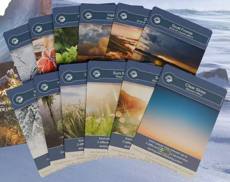 Adapt your strategy to the dynamic weather of each round. All players may capitalize on limited-time effects such as activating abilities twice, earning bonus resources, or making more efficient resource conversions.