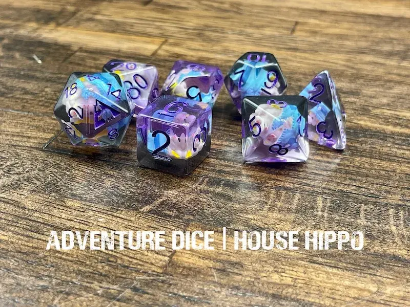House Hippo dice set features transparent layers of purple, clear, and black, with a tiny hippo in a chip bag inclusion, and purple numbers. This is an Adventure Dice exclusive set!